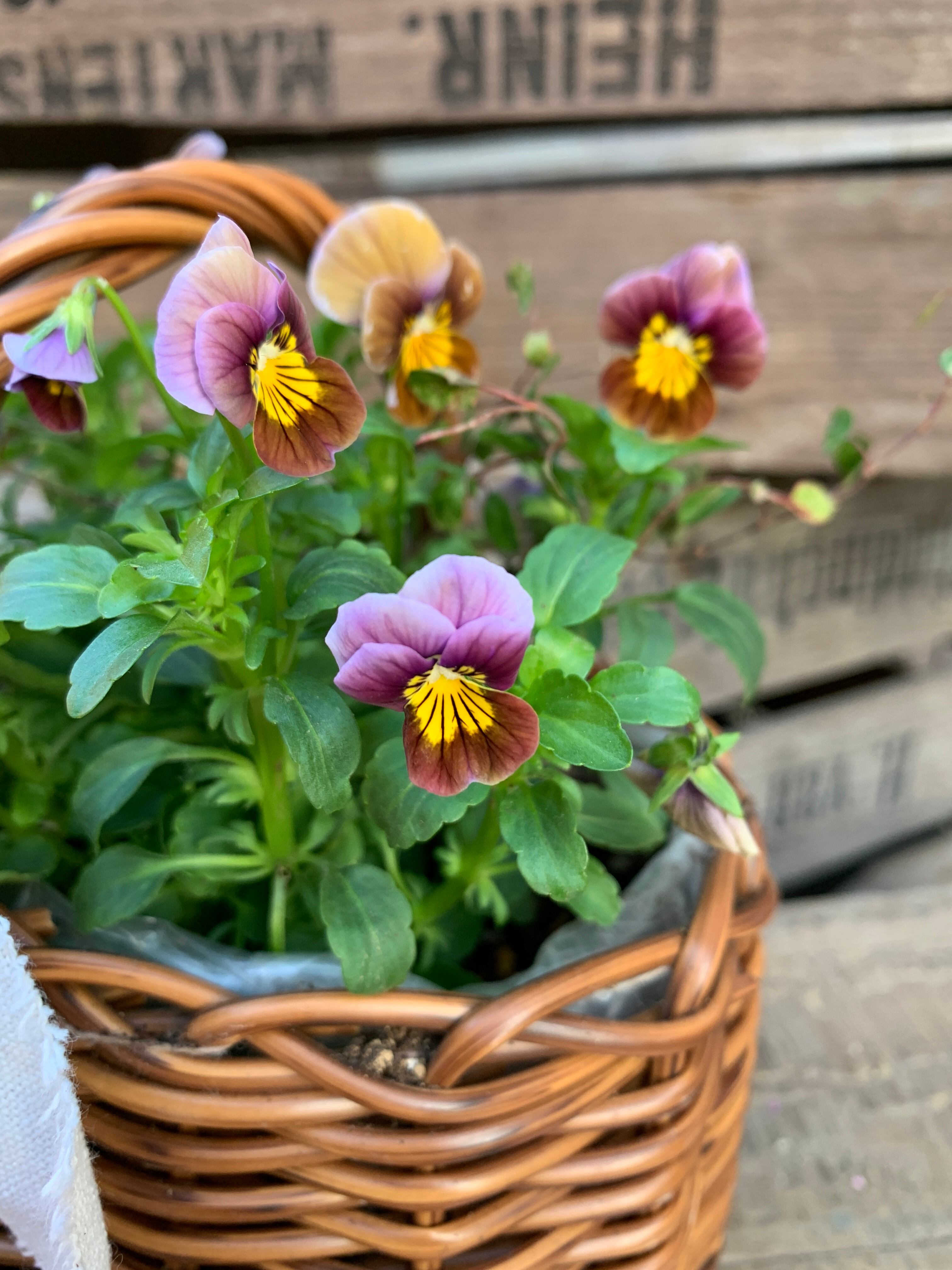 玄関前を彩る可愛らしい植物たちをお届けします。 ①プレミアムなビオラペルクレアとルメックスの寄せ植えに、②アンティークなおしゃれビオラ、フロステッドチョコレート、そして③ワイルドストロベリーの3つをセットにしました。